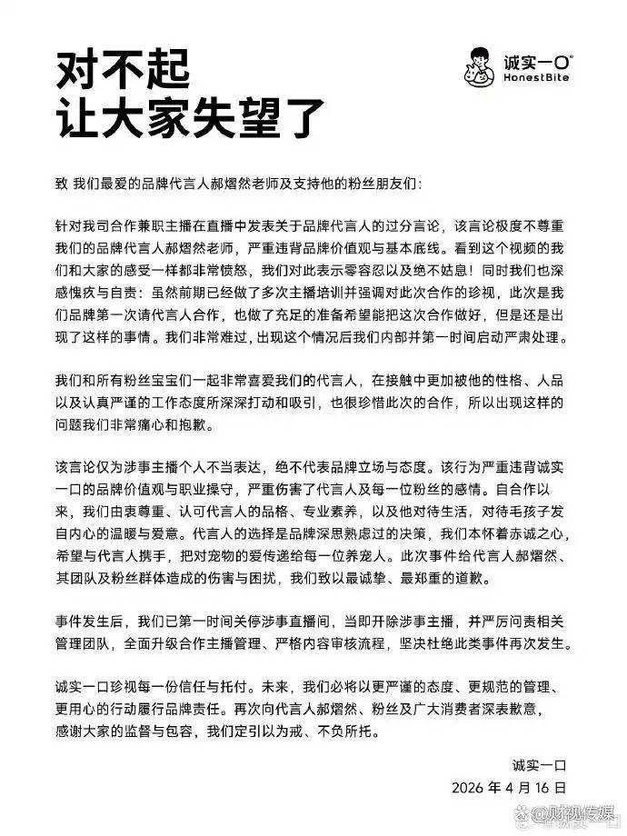 事发当日,诚实一口发布致歉声明,称涉事言论“极度不尊重代言人,严重违背品牌价值观与基本底线”,表示已第一时间关停直播间、开除主播,并对管理团队启动问责,承诺全面升级主播管理与内容审核机制。然而,道歉未能平息争议。4日凌晨,品牌创始人吕依凌再次出镜致歉,承认事件反映公司管理层面的严重失责。