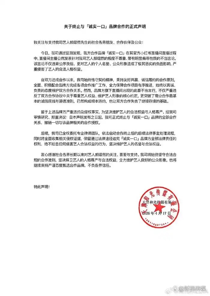 几乎同时,郝熠然所属经纪公司和光传媒发布声明,宣布终止与诚实一口的全部合作关系。声明指出,直播间言论带有明显侮辱性质,已对艺人名誉和公众形象造成恶劣影响,品牌方未能有效管理官方直播内容,违反了合作协议中“尊重艺人、维护形象”的核心约定,构成根本违约。和光传媒表示已委托律师团队推进后续法律维权。